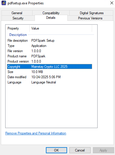 The file’s properties indicate that it’s a PDF software and the publisher as Mainstay Crypto.